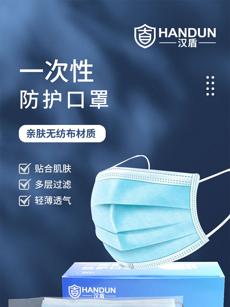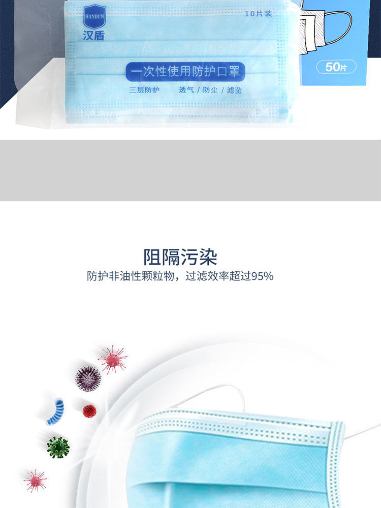 汉盾 HD1095 三层蓝色一次性平面口罩 50只