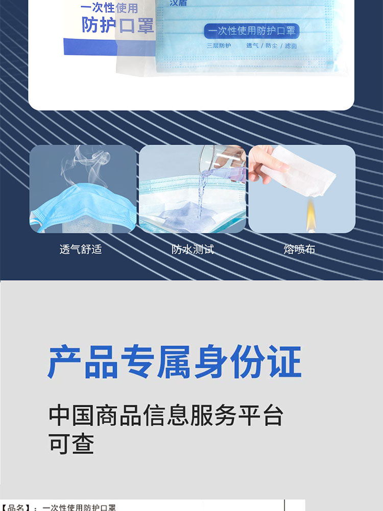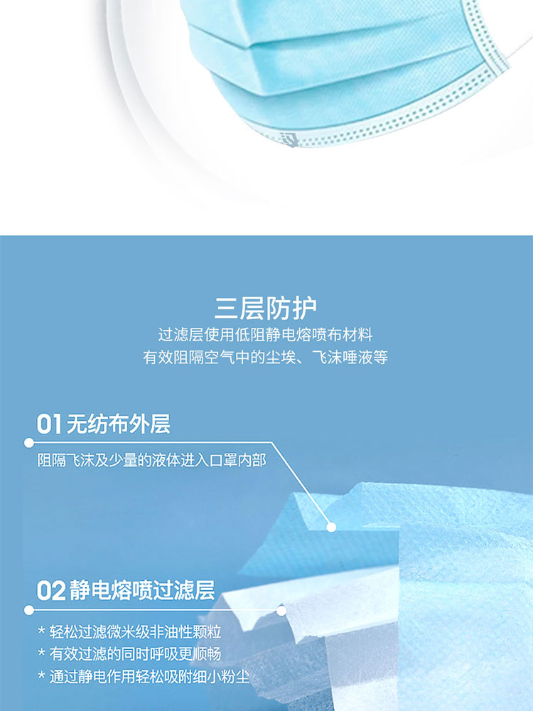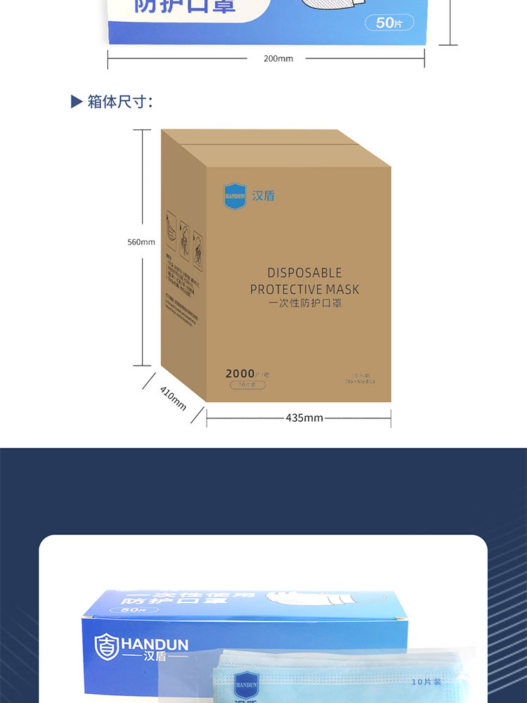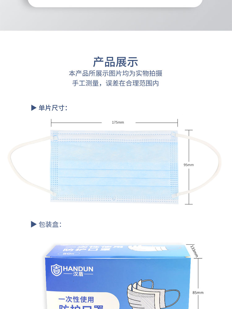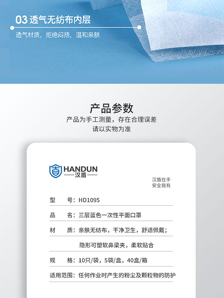• 汉盾 HD1095 三层蓝色一次性平面口罩 50只